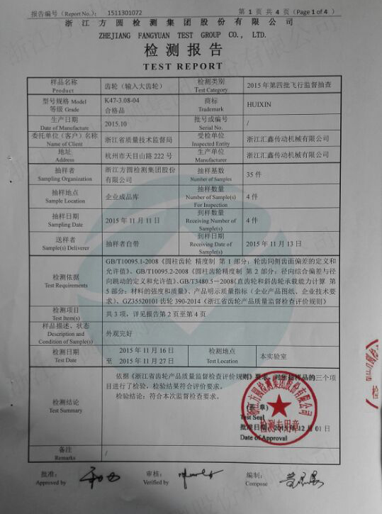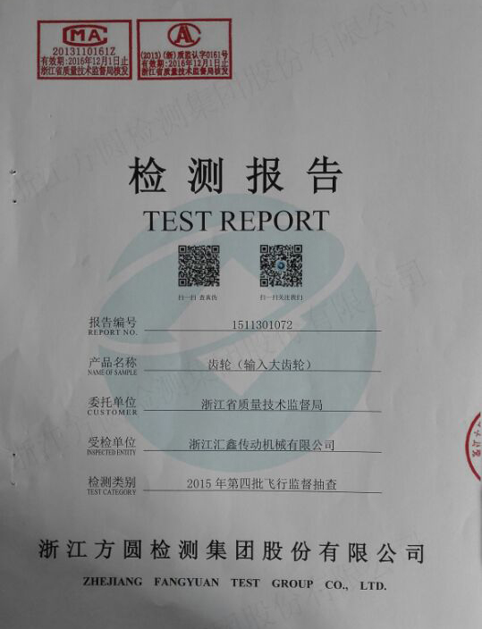 發(fā)布日期:[2016-01-04] 點(diǎn)擊率:浙江匯鑫傳動(dòng)機(jī)械有限公司擁有著完善的檢測設(shè)備、先進(jìn)的生產(chǎn)工藝、專業(yè)的制造技術(shù)、完善的質(zhì)量管理體系、具有雄厚的研發(fā)技術(shù)實(shí)力。優(yōu)良的減速機(jī)等傳動(dòng)產(chǎn)品一直享有廣大用戶的認(rèn)可和好評(píng)。產(chǎn)品質(zhì)量不但通過IS09002質(zhì)量體系標(biāo)準(zhǔn)認(rèn)證,且在2015年12月通過了浙江省技術(shù)監(jiān)督局的突擊抽查,雖然是突如其來的隨機(jī)抽查,但結(jié)論證明匯鑫產(chǎn)品的品質(zhì)始終經(jīng)得起考驗(yàn),所謂“內(nèi)行看門道”,業(yè)界的有識(shí)之士更明白這一張張用數(shù)據(jù)說明的《檢測報(bào)告》其含金量,比華麗的品牌包裝更具有說服力,這代表著浙江匯鑫傳動(dòng)機(jī)械有限公司的硬實(shí)力,更標(biāo)志著匯鑫產(chǎn)品打造國內(nèi)一流品牌的里程碑!